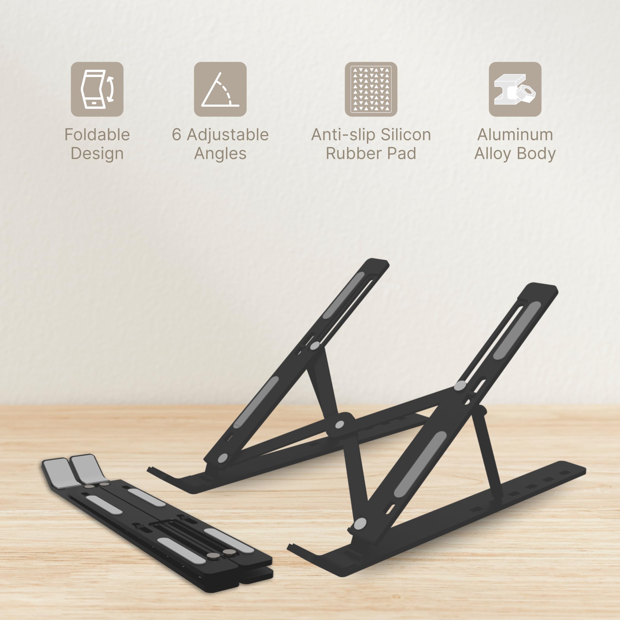 Adjustable laptop stand. Improves ergonomics and airflow.